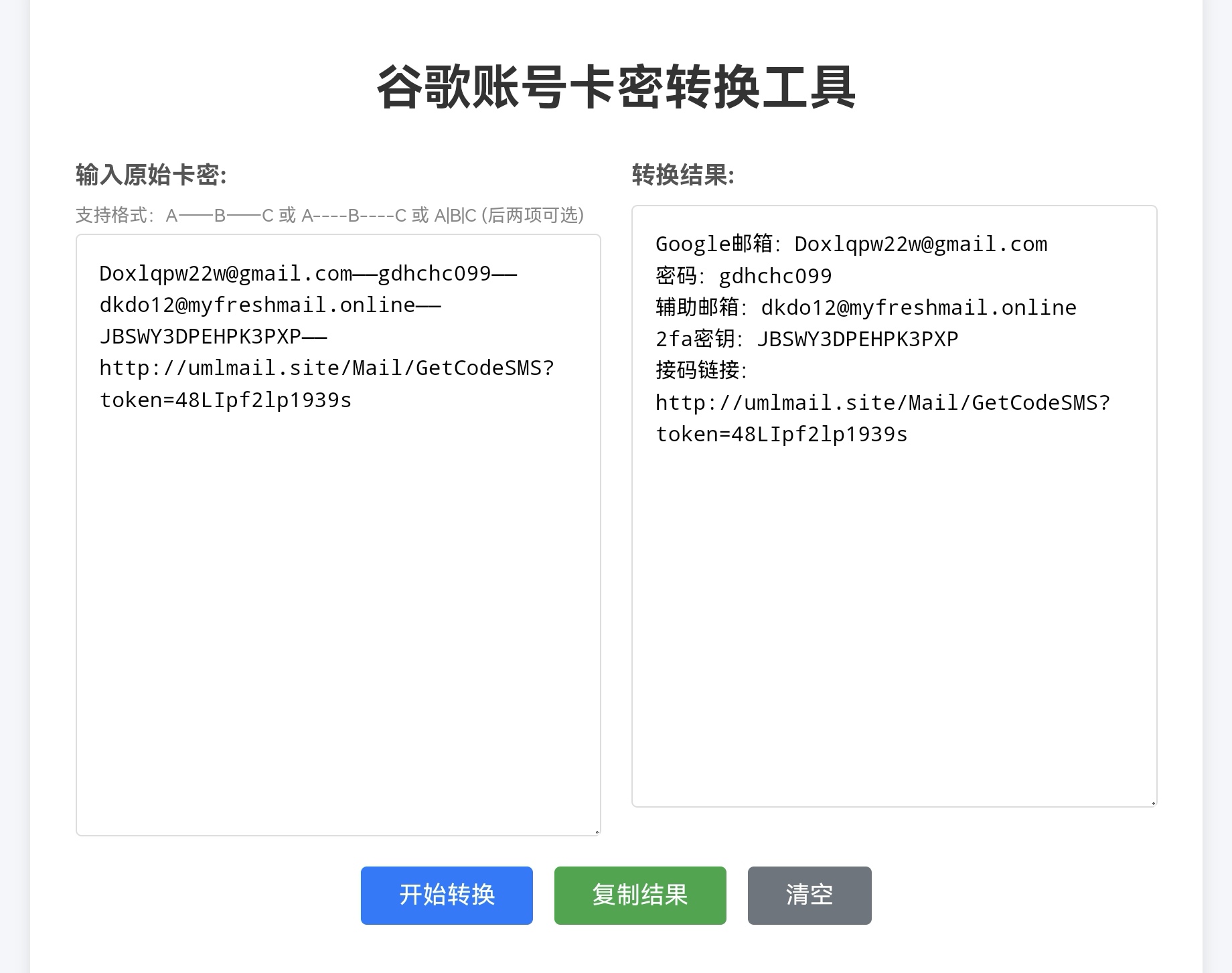 这里建议使用我们的卡密一键转换工具http://kami.952134.xyz/,将购买到的卡密复制到左侧框中,即可得到Google账号、密码、辅助邮箱、2fa密钥和接码链接(妥善保管,后面都能用到)